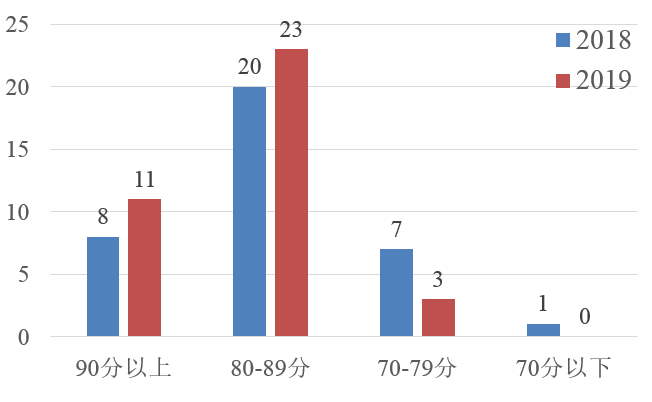 (一)政府采購信息公開整體水平明顯提升。各地區(qū)高度重視政府采購信息發(fā)布平臺(tái)建設(shè),普遍加強(qiáng)了對(duì)采購項(xiàng)目信息發(fā)布的監(jiān)管力度,其中,北京、福建、廣東、天津等地區(qū)政府采購信息公開工作一直穩(wěn)定在較高水平。從得分分布看(圖1),高分段地區(qū)增多、低分段地區(qū)減少,90分以上地區(qū)由2018年的8個(gè)增加到2019年的11個(gè),80分以下地區(qū)由2018年的8個(gè)減少到2019年的3個(gè),首次實(shí)現(xiàn)沒有低于70分的地區(qū)。