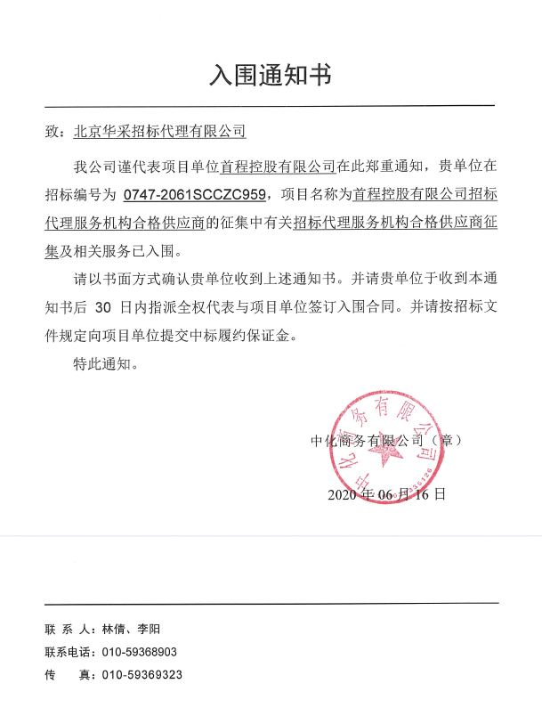 北京華采招標代理有限公司成功入圍首程控股有限公司招標代理機構(gòu)